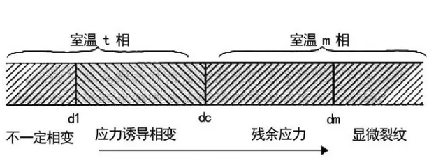 誘發(fā)顯維裂紋的臨界直徑dm。當(dāng)d>dc的晶粒室溫下為m相,由于相變的體積效應(yīng),產(chǎn)生顯微裂紋或應(yīng)力。d>dm的晶粒相變時,相變產(chǎn)生的積累變形大,誘發(fā)顯微裂紋。dc>d>dm的晶粒相變時,相變產(chǎn)生的積累變形小,不足誘發(fā)顯維裂紋,當(dāng)其周圍存在殘余應(yīng)力。