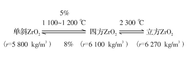 二氧化鋯還具有馬氏體相變的特性, 這是二氧化鋯被用來提高陶瓷材料的韌性和耐火材料熱震穩(wěn)定性的重要依據(jù)。單斜二氧化鋯不能直接用來制造制品,在溫度發(fā)生變化時會產(chǎn)生相結(jié)構(gòu)的轉(zhuǎn)變: