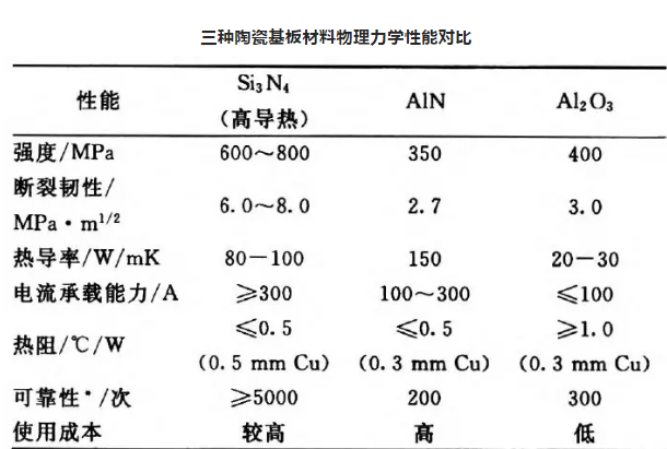 此外,氮化硅的線膨脹系數(shù)與Si、SiC和GaAs等半導(dǎo)體材料匹配良好,這使氮化硅陶瓷成為一種極具有吸引力的高強(qiáng)高導(dǎo)熱電子器件基板材料。氮化硅、氮化鋁及氧化鋁陶瓷的力學(xué)性能對(duì)比見(jiàn)下表。